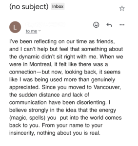 The message above is an actual email I received on the morning of Sunday, July 20, 2025. The sender is someone I met her through Bumble BFF (a platform for meeting female friends) while I was in Montreal taking care of my late mother’s home. We had only known each other for less than two month before I returned to Vancouver. Below is my contemplative response to her email. I have not written back, nor do I intend to.